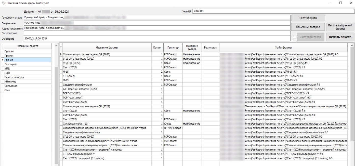 Модуль позволяет создавать пакеты с формами разработанными во встроенном генераторе FastReport. Возможна печать только выбранной формы или всех форм входящих в пакет. При необходимости, перед печатью, корректируется заголовок документа и описание товаров. Список документов поступает из реестра Фолио WinСклад, при этом возможно объединить несколько документов и вывести на печать как единый документ. Реализована дополнительная функция изъятия товара в необходимом количестве, смена единицы измерения, а так же коррекция цены с точностью вплоть до 11 знаков после запятой. Выбор принтера для каждой формы и количества копий. Уровни доступа могут ограничивать функционал программы.